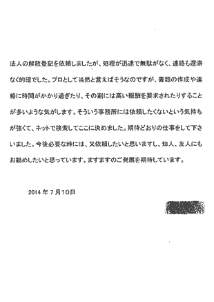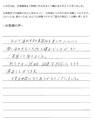 処理が迅速で無駄がなく、連絡も遅滞なく的確でした。知人、友人にもお勧めしたいと思っています。